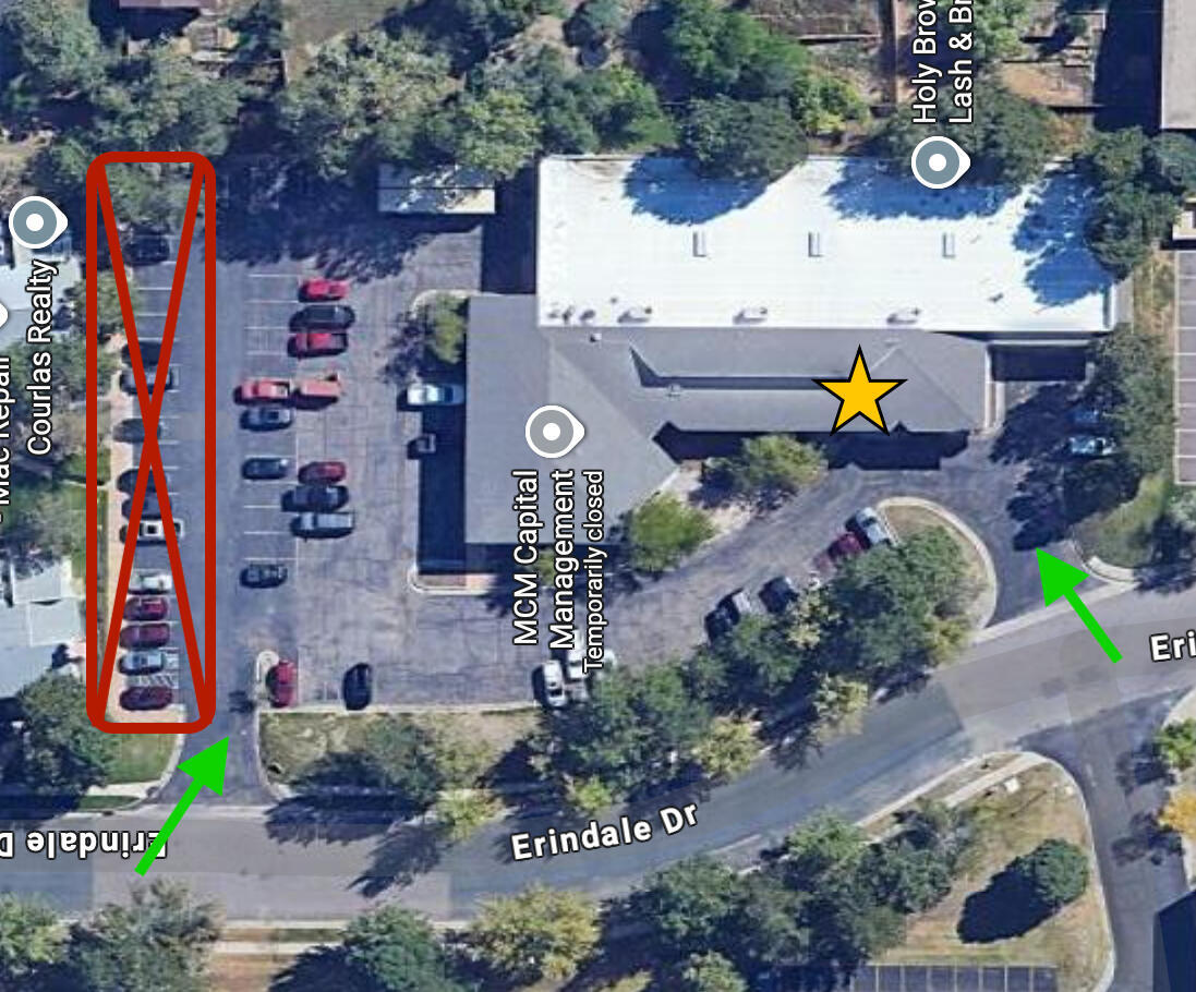 There is a large amount of parking at the building, but please make sure you do not park in the red crossed out section in the above picture. Please park as close to the 5525 Erindale Dr building as possible. The star represents where the studio is within the building.